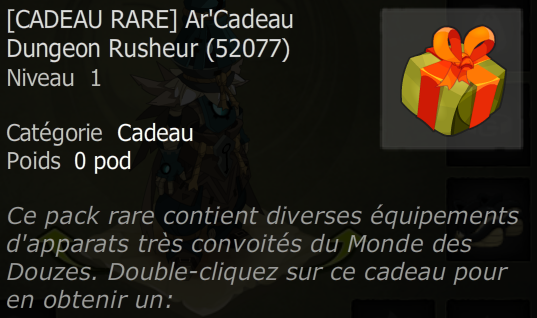 Nous vous annonçons l'ajout du Ar'Cadeau Dungeon Rusheur ! Celui-ci s'obtient dans différents donjon, en effet il vous faudra combattre le dernier donjon de la liste des rotations de bonus donjon pour espérer l'obtenir.